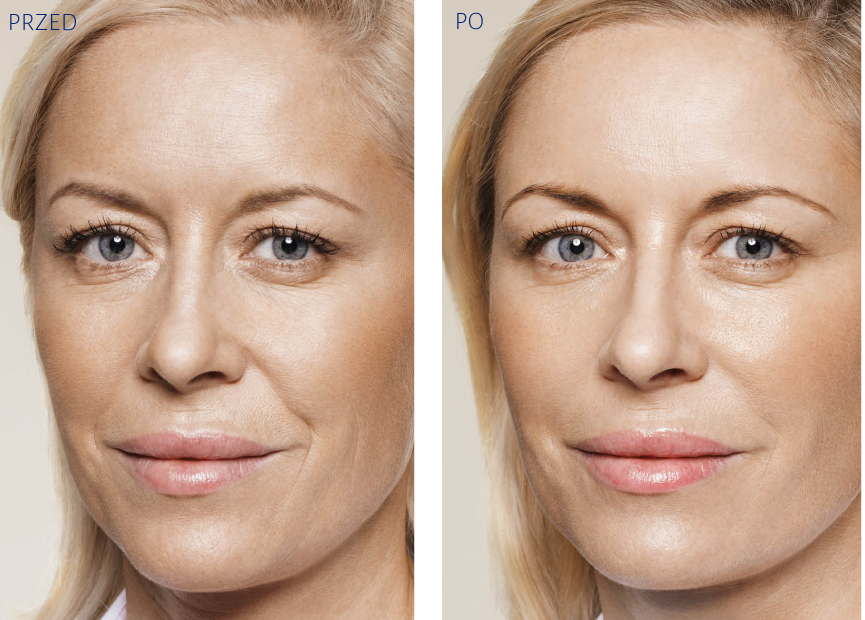 - Malejącą objętość skóry - objętość skóry zmniejsza się wraz z wiekiem. Co powoduje pojawienie się zagłębień na twarzy i utratę pełności w obszarach takich jak: pod oczami, wargami oraz na policzkach.